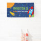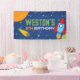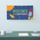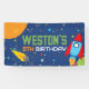 Bannière d'anniversaire en vinyle Espace extra-atmosphérique. Personnalisation du nom et de l'âge incluse. En bleu marine, bleu, orange, jaune, vert et rouge. Fusée rouge et bleue.