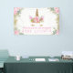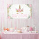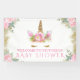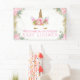Bannière de baby shower Unicorne avec adorable visage de licorne rose et or floral avec de jolis cils d'or et corne sur un bel arrière - plan rose et or fleuri. Cette jolie bannière de baby shower de licorne est facilement customisée avec le texte de votre choix.