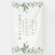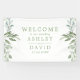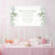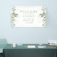 Bannière de bienvenue de mariage à la campagne avec aquarelle verte. Ce design botanique simple et élégant présente des feuilles de style aquarelle eucalyptus dans des nuances de vert et de blanc.