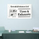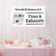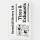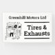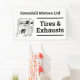 Vente de pneus. Bannière de garage. Entretien des voitures, pneus, gaz d'échappement et réparations des véhicules. Noir et blanc.