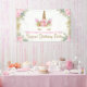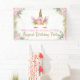 Bannière de fête d'anniversaire licorne avec un adorable visage de licorne floral rose et or avec de jolies cils et une corne dorées sur un fond floral rose et or magnifique. Cette bannière d'anniversaire licorne mignonne est facilement personnalisable avec le texte de votre choix.