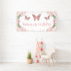 Bannière de joyeux anniversaire sur le thème du papillon doux comprenant deux adorables arrangements floraux roses à l'aquarelle, un papillon à paillettes roses et quelques textes calligraphiés. Ce fond de joyeux anniversaire aux papillons est un ajout charmant à la fête du premier anniversaire de votre petite fille sur le thème des papillons.