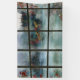 Un petit matin, un paysage d'automne froid regardé par une fenêtre gelée. Les sapins et les pins avec la glace qui blanchit leurs aiguilles, les érables dans les tons de rouge, orange et jaune, herbe blanchie au gel vue à travers le brouillard s'élevant d'un ruisseau caché. Les feuilles roses rouges et verts sont placés de chaque côté, à côté de la fenêtre.