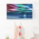 Dans la baie d'une terre gelée, un grand iceberg flotte dans la mer bleue froide. Les flocons de neige et les étoiles scintillent la scène, et dans le ciel, les aurores brillent dans les tons rose, lavande, vert et bleu.