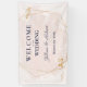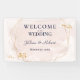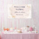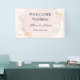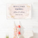 Une élégante bannière suspendue de réception de mariage conçue avec un fond rose, un texte bleu marine et des reflets dorés. Le texte comprend : Bienvenue à notre mariage, les prénoms des mariés et la date du mariage. Pour personnaliser, insérez simplement vos informations dans notre modèle facile, en remplaçant le texte d'exemple. N'oubliez pas de consulter l'ensemble de la collection Mariage rose et or pour les cartes et accessoires assortis.
