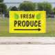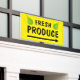 Panneau de bannières de produits frais avec logo poires vertes et flèche pointant pour indiquer où aller. Faites pivoter la flèche vers la gauche ou la droite. Vendre des fruits, des légumes, des herbes, du miel et d'autres aliments maison de jardin, maison, ferme, marché, magasin, épicerie, bureau, entreprise, entreprise, entreprise, maison, etc. Signalisation routière simple et visible avec logo fruitier et couleur jaune arrière - plan. Idéal aussi pour les marmites, les marmites et les maraîchers.