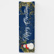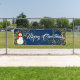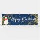 Cette bannière de Noël est présentée dans le style extérieur avec des grommets. Choisissez à l'intérieur ou à l'extérieur, avec ou sans grommets. Montré en bleu marine avec blanc "Joyeux Noël" avec Snowman et script fantaisie avec deux tourbillons d'étoiles à l'aspect or à chaque extrémité.