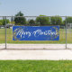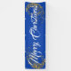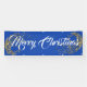 Cette bannière de vacances est présentée dans le style extérieur avec des grommets. Choisissez à l'intérieur ou à l'extérieur, avec ou sans grommets. Montré en Bleu avec blanc "Joyeux Noël" script fantaisie avec deux tourbillons d'étoiles à l'aspect or à chaque extrémité. Customisez ou achetez comme prévu.