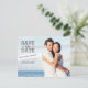 Une typographie amusante et une bannière nautique blanche volante ajoutent du style à cette carte postale avec votre photo fiançailles, et les informations "Save the Date" en texte gris sur le côté gauche de l'avant. Des couleurs gris doux et neutres encadrent les détails sur l'arrière où vous customisez tous les détails importants ; date mariage, site Web et message personnel. Parfait pour un portrait décalé.