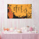 Bannière personnalisée de la fête d'Halloween. Il comprend un arbre effrayant, des citrouilles jack-o'lanterne et un chat noir. Arrière - plan est un ciel orange avec des chauves-souris. Découvrez nos autres bannières Halloween personnalisées dans cette collection :