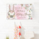 Bannière de baby shower lapin avec adorable lapin lapin lapin lapin de petite fille avec de jolies fleurs dans ses cheveux sur un bel arrière - plan de fleurs d'aquarelle vintage. Cette jolie bannière de baby shower lapin est facilement customisée avec le texte de votre choix.