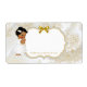 Belle petite fille dans sa robe de baptême et son collier de croix d'or. Arrière - plan est blanc satin & or filigree avec un cadre parties scintillant or et argent et embellissement arc. Texte laissé vide pour écrire dans chaque adresse et utiliser comme étiquette postal.