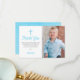 Merci à votre famille et à vos amis d'avoir assisté au premier anniversaire et au baptême de votre bébé avec une photo de votre enfant. Le design bleu présente des pois blancs sur un arrière - plan bleu aquarelle au dos de la carte. Tout le texte peut être customisé, y compris le nom de votre enfant et le message.