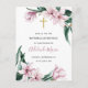 Une carte postale d'invitation élégante pour le baptême double et les événements de premier anniversaire. La jolie invitation à la floraison présente des magnolias roses délicates et des feuilles verts doux. Le design floral aquarelle encadre une croix d'or et l'information de l'événement. Au verso, vous pouvez ajouter les emplacements de l'événement, les informations RSVP et les détails de la fête d'anniversaire.