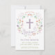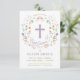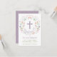 Ce joli et élégant baptême, invitation à baptiser, présente une couronne florale illustrée avec le mot "baptême" encerclant une croix. La couleur du texte, la police et le message peuvent être changés à votre goût. L'arrière de l'invitation est muni d'un arrière - plan violet (qui peut être échangé à n'importe quelle couleur de votre choix) avec un motif en quatrefoil blanc.