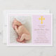 Invitation au baptême de la lavande avec une photo de votre bébé sur la gauche, croix jaune avec baptême ou détails de fête sur la droite en marron.