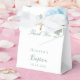 Chic white background decorated with light blue watercolored coloured roses, florals, flowers, eucalyptus greenery. A golden cross. With the text: Baptism and Thank You written with a modern black coloured hand lettered style script. Personalize and a name and a date.