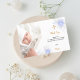 A modern and elegant baptism thank you card. A chic white background decorated with blue and white florals, flowers and a golden cross. Personalize and add your photo of the child, thank you note and name.
