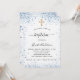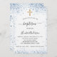 A modern, elegant baptism, celebrating a baby boy. White background decorated with blue faux glitter sparkles and a golden cross. Personalize and add a name and party details. Black colored letters.