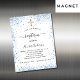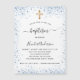 A modern, elegant baptism, celebrating a baby boy. White background decorated with blue faux glitter sparkles and a golden cross. Personalize and add a name and party details. Black coloured letters.