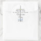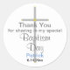 Thank You Baptism Son round stickers. Simple hand-painted silver cross with gold accents against a white background. Personalize with your child's name shown in elegant blue script, and date in black text. Original Graphic Artwork and Design © TamiraZDesigns.