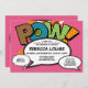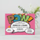 A pink fun, cool and trendy comic book inspired baptism, christening invitation that puts the wham, zap, pow into your superhero's celebration event. The reverse features a matching comic book pink polka dot pattern and speech bubble for extra event details and address. Designed by Thisisnotme©