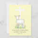 A baptism congratulations greeting card decorated with a little white lamb sketched with ink and coloured pencil with a white cross on a soft yellow background. You can customize the back with text you can edit to say what you'd like.
