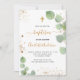 A white background decorated with eucalyptus greenery and faux gold glitter dust. Personalize and the childs name and ceremony details. Black and golden coloured letters. Gender neutral.