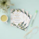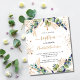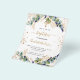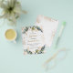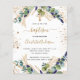A white background decorated with eucalyptus greenery and golden leaves and faux gold glitter drops. Personalize and the childs name and ceremony details. Black and golden coloured letters.