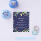 A navy blue background decorated with eucalyptus greenery and golden leaves and faux gold glitter sparkles. A golden cross. Personalize and the child's name and ceremony details.