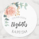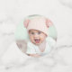 A chic white background decorated with a rose gold, blush flower, rose and eucalyptus greenery. Personalize and add a photo, date, name.