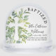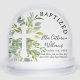 Greenery Floral Botanical Cross Custom Snow Globe features a simple white cross on green hand painted eucalyptus leaves and greenery with your special Baptism text below. Personalize by editing the text in the text boxes provided. Designed by ©2025 Evco Studio www.zazzle.com/store/evcostudio