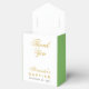 On the flap, it has a faux gold foil cross in a greenery wreath. Covered by the flap, there are the words Thank You in a golden calligraphic script. In the lower part, the name is written in the same golden calligraphy, the occasion in golden caps and the date in small black caps.