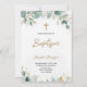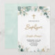 Front of a baptism invitation with elegant typography, featuring a gold cross and green leaves. The tone is serene and celebratory.
