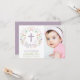 This elegant and pretty baptism, christening invitation features an illustrated floral wreath with the word "Baptism" encircling a cross. The right side of the card includes a customizable photo area. The text colour, font and message can be changed to your liking. The back of the invite features a purple background (that can be swapped to any colour of your choice) with a white quatrefoil pattern.
