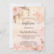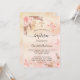 A rose gold, blush pink rustic faux metallic looking background. Decorated with rose gold and pink florals, roses, pampas grass, butterflies and a golden cross. Personalize and add a name and the details.