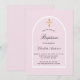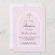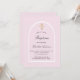 A blush pink background and an arch frame. Personalize and a name and ceremony details. Elegant hand lettered style script.