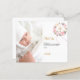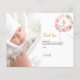 A modern and elegant baptism thank you card. A chic white background decorated with a watercolored pink and white floral wreath, a pink bow and a golden cross. Personalize and add your photo of the child, thank you note and name.