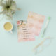A rose gold and blush pink gradient background decorated with eucalyptus greenery, a rose gold and blush pink rose, and golden leaves and faux silver glitter drops. Personalize and the childs name and ceremony details.