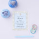 Faux silver and light blue coloured background decorated with faux silver glitter sparkles. Personalize and add a name and the details. Black coloured letters.