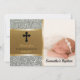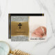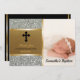 Lovely silver and gold baptism or christening photo thank you cards- Baby's vertical photo on the right side with baby's name at the bottom in script lettering. Background on the left is faux silver glitter for a shiny look. Reads 'Thank You for sharing my special day' in black and gold with date in gold. Christian cross at the top. Thin gold look vertical ribbon in the centre separates the two halves. Back has matching black background and gold metallic look ribbon borders. Note: All images are printed. Not actual glitter or metal. Elegant, baby baptism thank you cards for new baby boy or baby girl to show your appreciation for your guests. Click Customize option to change text colours, size, and font styles. Visit our Zazzle.com/angela65 shop for other personalized photo baptism cards.