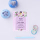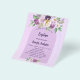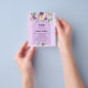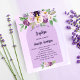 A violet, lavender watercolored background. Decorated with violet and purple watercolored flowers and a golden cross. Personalize and the name and reception details.