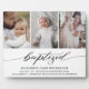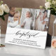 Stylish, modern photo collage plaque. ''Baptized'' is featured in a sophisticated typographic script with stylish handwritten lettering on a white background. Customize with a name, the date, the place of the baptism, and the godparents' names. ideal as a gift or keepsake.