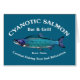 Un Saumon Sockeye aux tons bleus avec le texte "Cyanotic Saumon Bar & Grill Kenai, Alaska" et "Combat Fishing Rest And Relaxation. La pêche au saumon est très populaire, trop populaire en Alaska. Imaginez des centaines de pêcheurs, à peu près côte à côte, longeant les deux rives d'un ruisseau essayant d'éviter de traverser les lignes avec tout le monde dans l'espoir d'atterrir un grand saumon. C'est de la pêche au combat. Après un jour de cela, prenez un peu de R&R au mythique Saumon cyanotique de Kenai. Des contes de pêche y ont raconté...un peu vrai.