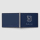 This elegant minimalist Bar Mitzvah party Guest Book has a navy blue background, grey monogram, and white script text. Easy to personalize, just change or delete example name and text on front and spine. All Rights Reserved © 2024 Alan & Marcia Socolik.