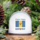 Personalized snow globe with the Bajan flag and the word BARBADOS below in the flag colours. Above, in blue letters, is a spot for a name to make a special holiday gift or stocking stuffer.