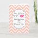 Une carte de remerciement avec un design moderne - des lèvres roses glamour et une illustration de moustache rétro masculine. Sur un fond chevron pêche. Le texte dit M. et Mme et vous pouvez personnaliser avec vos noms et date de mariage. l'intérieur contient un message que vous pouvez laisser tel quel ou personnaliser.