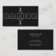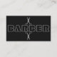 Promote your barbershop with this logo barber business card featuring trendy silver grey modern bold geometric typography script with scissors over a black (changeable) background. +++++++++ Easy to personalize on the backside with your name, title and contact details. ++++++++ Suitable for men salon, self employed barbers, professional barber stylists.