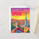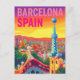An extremely vibrant and graphic vintage-style travel poster for Barcelona, Spain. The artwork features the colorful, unique architecture of Gaudi against a stunning pink and orange sunset skyline. This bold retro illustration is perfect for lovers of Spanish cities, modern art, and highly stylized travel posters.