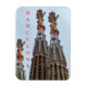 A close up view of the intricately decorated steeples on the Sagrada Familia church in Barcelona in Spain printed on a souvenir fridge magnet.